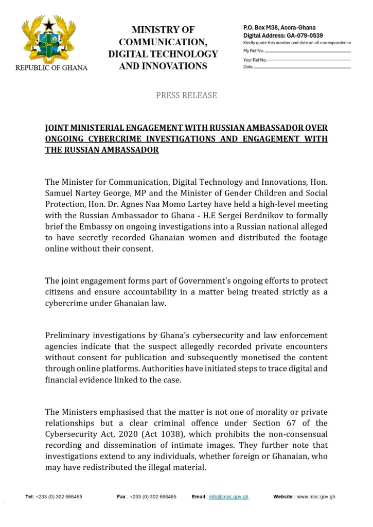 According to the Minister, he and the Minister for Gender, Children and Social Protection, Naa Momo Lartey, held discussions with the Russian envoy regarding allegations against Vladislav Luilkov. The individual is alleged to have engaged in the non-consensual recording of women.