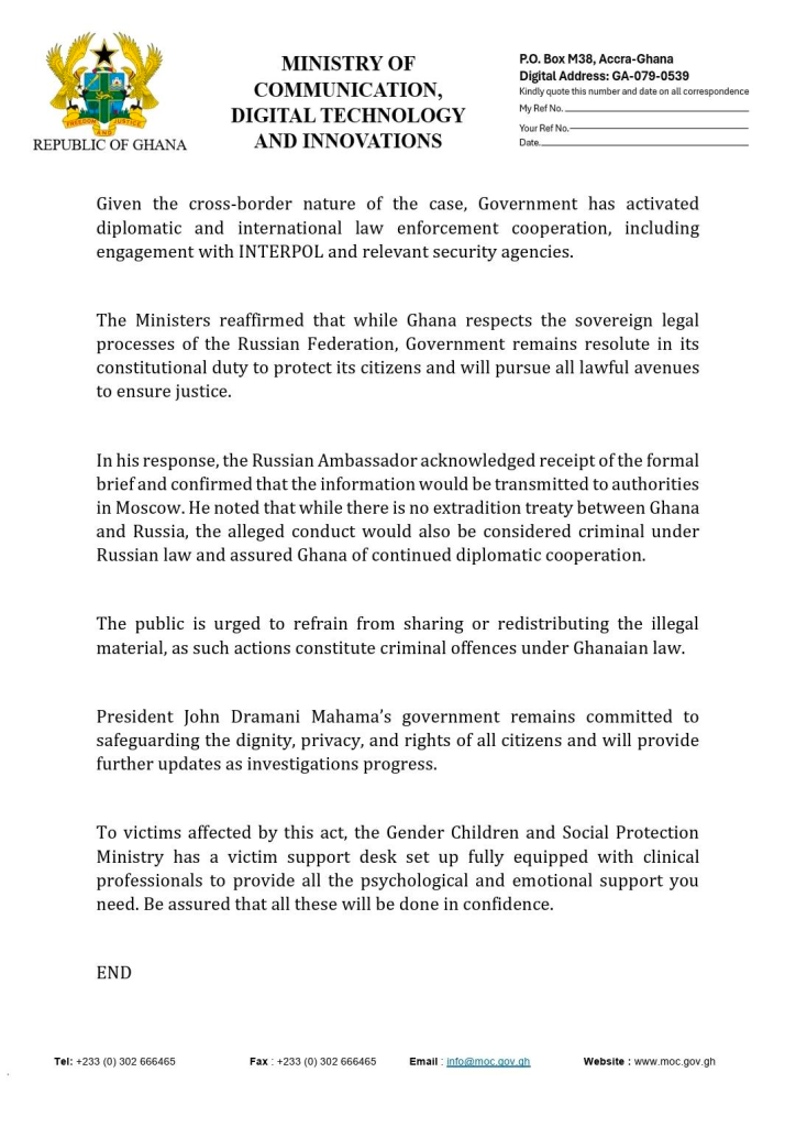During the meeting, Ghanaian authorities presented information currently available to them concerning the case and reiterated their commitment to pursuing justice through appropriate legal channels. The ministers emphasized that Ghana would rely on all lawful mechanisms to ensure that Section 67 of the Cyber Security Act, 2020 (Act 1038) is fully enforced. The provision addresses cyber-related offences, including the unlawful recording and distribution of intimate images.