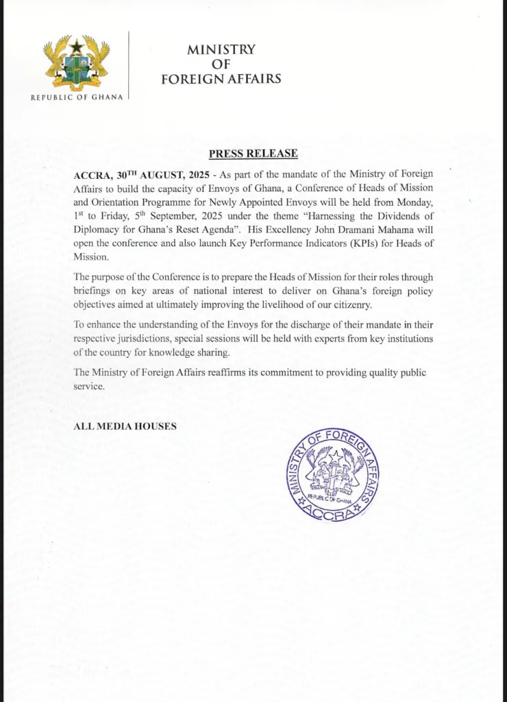 The event, slated for Monday, September 1 to Friday, September 5, 2025, will be held under the theme “Harnessing the Dividends of Diplomacy for Ghana’s Reset Agenda.” President John Dramani Mahama is expected to formally open the conference and launch new Key Performance Indicators (KPIs) to guide the work of Ghana’s ambassadors and high commissioners.