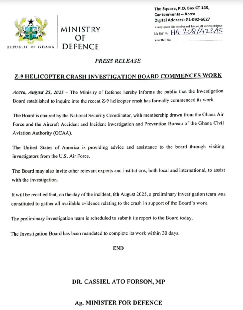 In a statement signed by Acting Defence Minister, Dr. Cassiel Ato Forson, the Ministry said the Board is chaired by the National Security Coordinator, with membership drawn from the Ghana Air Force, the Aircraft Accident and Incident Investigation and Prevention Bureau, and the Ghana Civil Aviation Authority (GCAA).