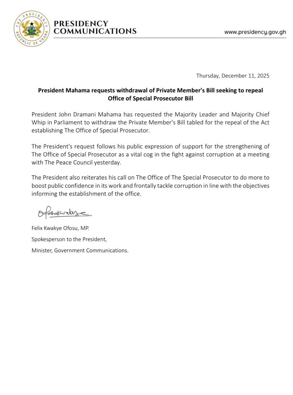 “President John Dramani Mahama has requested the Majority Leader and Majority Chief Whip to withdraw the Private Members’ Bill aimed at repealing the Act that created the Office of the Special Prosecutor,” the statement read.